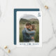 This wedding save the date card features a serene, pastoral design with a central rectangular photo placeholder showcasing two people embracing in a field of tall grasses. The layout is vertically oriented with ample negative space, creating a clean and balanced composition. The color palette includes muted greens, soft blues, and neutral grays, evoking a tranquil countryside atmosphere. Elegant serif typography highlights the names at the top and "SAVE THE DATE" at the bottom, while smaller italicized text indicates the location. The overall mood is warm and intimate, perfect for celebrating a personal and heartfelt occasion.