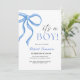 Elegant and Modern Baby Boy Shower Invitation in Blue and Gray, adorned with a Stylish Blue Ribbon and personalized Typography. Perfect for a Trendy and Memorable Celebration!