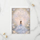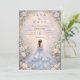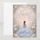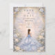 Este elegante design de quinceañera apresenta um fundo de aquarela azul pó suave emoldurado por rosas de marfim delicadas, folhagens sutis e detalhes ornamentados em dourado, com uma ilustração de vestido graciosa criando uma atmosfera refinada e inspirada em contos de fadas. A paleta azul fria combinada com flores românticas dá ao design um sentimento atemporal e luxuoso, perfeito para uma celebração clássica de quinceañera com uma estética de jardim elegante.