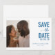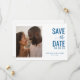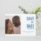 This wedding save the date card features a split layout with a warm, soft-focus photo on one side and elegant typography on the other. The color palette is dominated by deep blue text against a clean white background, creating a sophisticated contrast. The design combines serif and script-like fonts to convey formality and charm, while the minimalist approach ensures clarity and focus. Perfect for setting the tone for a joyous celebration, this card balances visual appeal with essential information in a modern yet timeless style.