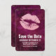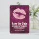 Festa de solteira salve o convite de data com lábios brilhantes de falso cor-de-rosa de tendência. O fundo é um padrão cor-de-rosa avermelhado escuro com folhas tropicais de palma.