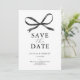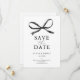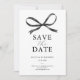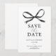 Os cartões de salvar a data do casamento apresentam um fundo branco simples, um laço de água-forte preto clássico e um modelo de texto elegante que é fácil de personalizar.