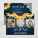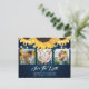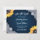 Cartões de save the date de casamento florais azul marinho rústicos com girassóis e renda floral branca em um fundo gradiente azul marinho. Personalize facilmente este cartão com suas imagens e detalhes do casamento. Itens correspondentes disponíveis. O fundo pode ser alterado para qualquer cor.