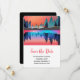 Salve o cartão com um belo design gráfico que apresenta um lago pacífico com veados. e pinheiros altos que se refletem na água. Estrelas sobrepõem-se.