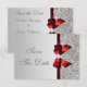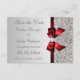 Convites de casamento elegantes e personalizados em cartão plano "Save the Date" prata e vermelho com uma bela imagem impressa com padrão de lantejoulas pratas, um lindo laço e fita vermelhos brilhantes impressos e uma bonita jóia diamante brilhante impressa. Esses convites sofisticados, glamorosos e fashion são decorados em ambos os lados. Convites lindos, chiques, modernos e atuais. Por favor, note: todos os convites na Zazzle têm imagens impressas planas. O texto, a fonte e a cor da fonte podem ser personalizados. Se precisar de ajuda para personalizar o seu produto, por favor entre em contato comigo através da minha loja. Estou à disposição para ajudar. Tenho produtos compatíveis na minha loja.
