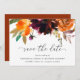 Rústico boho floral casamento Salve a Data com um buquê floral pintado aquarela com tons quentes e terrosos de laranja queimada, terracota e borgonha profundo junto com alguma folhagem. Este Salve a Data elegante com os tons ricos do outono é ótimo para um casamento de outono.