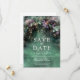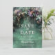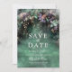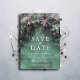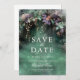 Uma ilustração com uma aquarela esbranquiçada da folhagem exuberante em verde esmeralda com tons de lavanda e lilás, cintilante com luzes de fadas e poeira mágica, decora esta primavera no verão queda quinceanera salvar o convite de data com um tema de floresta encantado. Um elegante e moderno salva a data para uma celebração de conto de fadas. Perfeito para meninas que amam o cenário de conto de fadas, a floresta de fadas ou o tema de jardim de fadas e verde esmeralda com um toque de roxo lavanda.