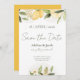 Sun on the terrace, a hint of sea breeze, and a bowl of lemons on the table—that’s the feeling behind this card. Hand-painted citrus and soft sage greenery frame modern, uncluttered type so your names take center stage. The lemon-colored back winks with optimism, like the first toast of the night. It’s a tiny keepsake of the season you’ll always remember: fresh, bright, and full of promise.