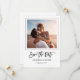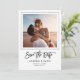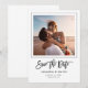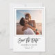 Anúncio minimalista moderno de Salve a Data com tipografia manuscrita de roteiro moderno, sua foto pessoal dentro de uma moldura fina e elegante ao lado do seu nome e data de casamento.