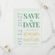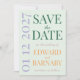 Compartilhe as novidades do seu casamento com este cartão de aviso prévio fresco e convidativo, apresentando um fundo verde suave com sotaques de lavanda e amarelo marigold. O design minimalista destaca numerais de data superdimensionados por trás de tipografia elegante, combinando letras maiúsculas verdes floresta com escrita rosa poeirenta. Ideal para celebrações de casamento inspiradas na natureza ou no jardim com um clima alegre e botânico.