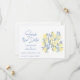 Anuncie seu dia especial com uma explosão de frescura usando nossas Vinhas Lemon Salvem o Cartão de Data. Este cartão delicioso apresenta vibrantes vinhas azuis e amarelas de limão, acrescentando um toque inspirado no Mediterrâneo ao seu casamento. Informe seus convidados sobre sua próxima celebração de uma forma brilhante e revigorante.