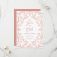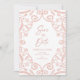 Este é um cartão perfeito para salvar a data do casamento, que parece real, romântico e elegante com um toque de brilho suave de rosa dourado, com um desenho de renda floral com folhas. Perfeito para as estações da Primavera e Verão, bem como durante todo o ano.