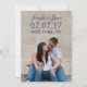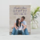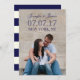 LINHAS MODERNAS | FOTO SALVE A PLACA DE DATA. ELKE CLARKE © para epclarke em Zazzle. Moderno salve o anúncio de data com sua foto de noivado na frente com a sobreposição de texto de fonte azul elegante do script marinho. No verso, um padrão ousado, azul marinho e listras de creme tem o texto do anúncio do casamento que você pode personalizar. Outras cores disponíveis.