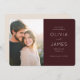 This elegant wedding save the date design features a warm, romantic photo area that captures a tender moment between two people. The layout is split with a rich maroon background on one side, complementing the soft, natural tones of the photograph. The typography is sophisticated and modern, adding to the overall timeless charm. Perfect for couples looking to announce their special day with grace and style, this invitation sets an intimate and heartfelt tone, inviting loved ones to celebrate this joyous occasion.