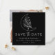 Convide amigos e família para salvar sua data de casamento com esta Lua Botânica Elegante e Estrelas salvem a data. O quadrado save the date card apresenta uma ilustração de uma lua feita em uma linha branca, adornada com estrelas cintilantes e uma folhagem botânica exuberante, todas colocadas sobre um fundo preto. A design é aprimorada com sutil caligrafia moderna, acrescentando um toque de sofisticação e talento contemporâneo. O convite reverte para mostrar sua foto de noivado quadrado sangrado de cheio.