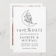 Convide amigos e família para salvar sua data de casamento com esta Elegante Lua Botânica e a foto das Estrelas para salvar a data. O livro save the date card apresenta uma ilustração da arte da linha preta de uma lua, enfeitada com estrelas cintilantes e uma folhagem botânica exuberante, todas colocadas sobre um fundo branco. A design é aprimorada com sutil caligrafia moderna, acrescentando um toque de sofisticação e talento contemporâneo. Personalize a parte de trás da data de salvamento com sua foto de noivado vertical e seu site de casamento.