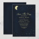 Cartão de Salvar a Data Lua Celestial Estrelas Azul Meia-Noite. Este design apresenta luzes de estrelas cintilantes com uma lua crescente brilhante no céu noturno estrelado.