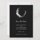 Salve a placa de data com uma ilustração mística. Uma lua azul escura com um contorno fino elegante e flores brancas ao longo das suas bordas.