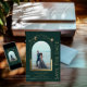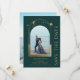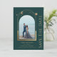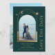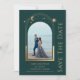 A Lua do Sol Dourada e Mística Verde Stars Espacial Galáxia Celestial Cosmos Astronomia Salva as Datas apresenta um sol dourado, lua e estrelas em um fundo verde. Dentro é a sua foto favorita e o seu personalizado salva as informações de data. Adicione uma foto adicional no verso. Personalize editando o texto nas caixas de texto. Projetado por ©2022 Evco Studio www.zazzle.com/store/evcostudio