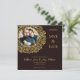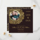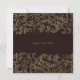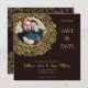 Este cartão save-the-date tem um fundo escuro elegante com sotaques florais de ouro. No canto superior esquerdo, há uma estrutura circular rica em decoração com padrões de ouro complexos, onde uma foto pode ser colocada. Todas as áreas de texto na placa são editáveis, permitindo a personalização da data, nomes, detalhes do evento e notas adicionais. O design geral dá uma sensação formal, luxuosa e comemorativa.