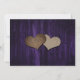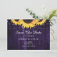 Cartão de aviso de casamento floral roxo e amarelo rústico com flores de girassol e luzes de corda em um fundo de madeira rústico.