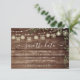 Anuncie o seu dia especial com estes cartões de aviso de casamento rústico com luzes de corda, luzes de jarro de pedra e madeira de celeiro country desgastada pelo tempo. ASSISTÊNCIA. Para assistência de design ou se você gostaria de itens coordenados, entre em contato com o designer via Zazzle Chat ou makeitaboutyoustore@gmail.com.