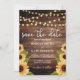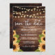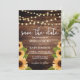 Convites de save the date temáticos de Madeira Rústica e Girassol em uma fonte sans serif e caligráfica para aquele clima amarelo vintage e divertido do casamento. Mais produtos nesta coleção.
