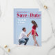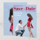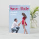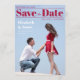 A modern wedding Save the Date that looks like a magazine cover. It has a pair of lovers photographed in the moment when the boy proposes to the girl, on his knee; the are seen from profile, with the blue sky in the background. In the upper part, the title Save the Date is written in big bold deep red fonts (except the word "the", that is in script, between two red lines. Above the title and the first line, to the left, there is the date; under the title and the second line, to the right, there is the place; both are also deep red. To the left of the two lovers, their names are written in white, with the message "Formal invitation to follow" in smaller white fonts under it.