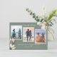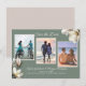 Cartões de "save the date" de casamento com tema sulista e três modelos de foto. Brancas, flores de magnólia sulista decoram os cantos de cartões horizontais cinza-verde. Os modelos de foto são escalonados com a esquerda um pouco mais alta que o centro e a foto da direita um pouco mais baixa. Fotos de qualquer orientação funcionarão se o assunto estiver no centro. "Save the date" no topo, com nomes completos, data e local do casamento na parte inferior. As cores combinam com a coleção de papelaria de magnólia sulista. Mostrado nos cartões de tamanho menor.