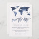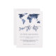 Este cartão de salve a data de casamento moderno e elegante apresenta um fundo com aparência de papel em aquarela branca com um mapa mundial em aquarela azul moderno e texto correspondente. Perfeito para o casamento de qualquer casal que adora viajar, ou qualquer pessoa que tenha um casamento de destino.