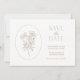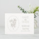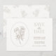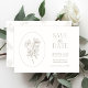 Elegância moderna com charme vintage do velho mundo. Este adorável cartão de save the date de casamento branco marfim e areia apresenta um conjunto contemporâneo de fontes taupe escuras, elementos de caligrafia e ilustração floral botânica. O verso eleva o design do cartão com uma adorável ilustração de padrão botânico para contraste.
