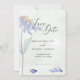 Casamento moderno dos Partidos Temáticos Salve a Data design apresenta margarida roxa-azul-d-água e tipografia moderna de script emparelhada com a letra serif tradicional. O design é colocado em amostras de cor verde-d'água de sábio rústico correspondentes e acentuado com pétalas de margarida correspondentes. #SaveTheDate #Daisies #ModernWedding