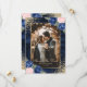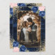 Elegante marinho azul e foto floral de núpcias salve o cartão de datilografia com rosas azul e azul de bebê com verde em um fundo de madeira de celeiro com uma foto dourada no meio. Personalize facilmente este modelo de cartão com a sua fotografia e os seus detalhes de casamento para criar uma fotografia de casamento floral única, salve o cartão de data para o seu marinho azul e a sua festa de casamento rosa pincelada.
