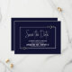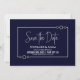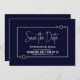 Avise seus amigos e entes queridos sobre sua data de casamento futura para garantir que todos possam participar e compartilhar a alegria de seu dia especial com este marinho azul com o cartão "Salvar o Encontro" de casamento de formato branco.