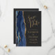 A borda esquerda deste elegante casamento moderno salve o cartão de data apresenta uma marinho azul de aquarela agata borda aparada com falso brilho dourado. O texto personalizável combina manuscrito dourado, fontes em copperplate e itálico em um fundo fora de preto. O verso fornece espaços para 5 fotos (3 horizontais 1 quadrado e 1 vertical) e espaço para o seu site de casamento URL ou outra mensagem breve.
