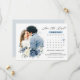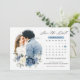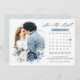 O calendário de casamentos florais azuis empobrecidos salva o cartão com buquê elegante de azul marinho, azul real, branco, marfim de champanhe, rosa de cor esbranquiçada, botões de flores ranunculus e folhas de eucalipto verdes e boquete elegante de aquarela. Entre em contato comigo para obter ajuda sobre a personalização ou se você precisar de outro produto com este design.