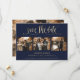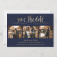 Elegante marinho azul e ouro, 4 cartões salve a data de fotos com um moderno título de roteiro de folha de ouro falso. Personalize facilmente este casamento azul marinho, salve a data com suas imagens e detalhes do casamento, incluindo um site de casamento.