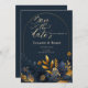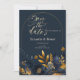 Flores azuis marinhos elegantes com folhas de ouro sobre fundo azul marinho. Salve a data que pode ser personalizada com seu nome. Selecione o botão "personalizar" para alterar o estilo, a cor e o tamanho da fonte.