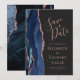 A borda esquerda deste elegante casamento moderno salve o cartão de data apresenta um marinho azul de aquarela agate borda aparada com falso rosa dourado. O texto personalizável combina a letra rosa-rosa, a letra copperplate e a letra itálico num fundo preto de ardósia. O verso apresenta um design marinho de agate azul e rosa dourado correspondente.