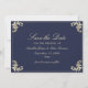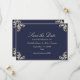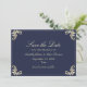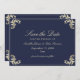O elegante marinho barroco azul e ouro, exceto o cartão de data com vintage ornamentado floresce, um monograma luxuoso de ouro no verso e fontes clássicas de escrita. Perfeito para eternos e casamentos formais, este na moda pode salvar a data é totalmente personalizável com seus nomes, data e detalhes de casamento. Um design sofisticado que impressiona os hóspedes enquanto combina com uma suíte de casamento barroca de luxo.