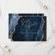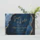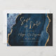 Este casamento elegante salve o cartão de data apresenta uma imagem de fundo da marinho azul de aquarela agada com falso brilho dourado. O texto personalizável combina manuscrito, protetor e fontes itálicas de cor dourada. O verso apresenta um design de agate marinho azul e dourado coordenador.