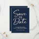 Casamento Salve o cartão de data em azul marinho e design minimalista. Este convite para salvar a data tem o aspecto chic de trazer a papelaria de casamento com o estilo moderno. Ele foi projetado para ajustado com uma variedade de temas ou estilos de casamento. A tipografia clara e escrita à mão e a design minimalista ajudarão a espalhar a palavra sobre o seu fabuloso casamento. Personalizado com os nomes da noiva e do noivo, a data do casamento e a localização. A cor de fundo desta carta também é personalizável e pode ser criada para corresponder perfeitamente às cores do seu casamento.