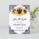 Casamento de girassol azul-rústico marinho personalizado salva os cartões de data com girassóis, lanternas e rendas florais azuis. Itens correspondentes disponíveis para complementar o casamento de chic marinho azul-rústico salve os cartões de data.