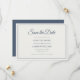 Anuncie seu casamento com elegância eterno. Este cenário Salve a placa de data apresenta uma frente de creme moldada em azul marinho empoeirado. O verso mostra as iniciais monogramas, informações do site e um código qr com fundo azul marinho empoeirado para um acabamento ousado e coeso. "Salvar a data" é realçado em caligrafia graciosa, com os nomes do casal em negrito itálico e os detalhes do evento em uma fonte serif clássica. Um amante refinado flanqueado por linhas junta os nomes no centro, criando um layout romântico equilibrado. Totalmente personalizável para corresponder à data e à localização do casamento. Perfeito para casamentos formais, minimalistas ou inspirados na natureza. Coordena-se perfeitamente com convites correspondentes, placas RSVP e invólucros de envelope na suíte Azul de Marinho Dusty.