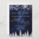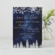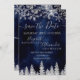 Hora de comemorar seu tema de casamento da terra maravilhosa do inverno com este luxo flocos de neve com brilho prateado faíscas e floresta de pinheiro com relva prateada em um elegante fundo azul-d'água festivo, com marinho moderno e legal tipografia de fontes. Um casamento chic e elegante salve o cartão.