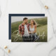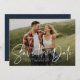 Com uma foto horizontal solteiro e um roteiro moderno escrito "salve a data", este cartão é a maneira perfeita de anunciar seu noivado e o próximo casamento para amigos e familiares. O texto branco é ousado e moderno, mas ainda sofisticado. O texto personalizável na frente tem espaço para nomes, data, local e outras informações como um site de casamento. A parte de trás é um clássico azul marinho com uma mancha estelar branca. A cor é editável clicando em "Personalizar".