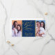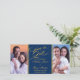 Duas colagens de fotos, elegante casamento azul e marinho dourado, salve o cartão de data. Texto clássico elegante do script de caligrafia que diz "Salvar a Data". Seu texto personalizado é mostrado em fontes de na moda complementares. O design apresenta 2 fotografias de noivado de cor que pode mudar para as suas próprias fotografias de noivado. Zazzle tem todos os tipos de recursos de "adicionar sua própria foto" e design de "fazer você mesmo". As únicas partes deste design que não podem ser personalizadas são as palavras "salvar a data" e o fundo azul marinho. Um elegante salva a data a um preço barato.