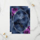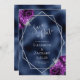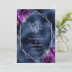 Este elegante casamento moderno, exceto o cartão de data, apresenta uma imagem geométrica prateada decorada com buquês florais roxas e prateadas num fundo azul marinho. O texto personalizável combina a escrita manual imétrica de cinzas prateadas, a placa de cobre e as fontes itálicas. O verso repete a imagem da folha azul.