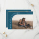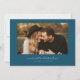 Modern and stylish save the date card featuring a text that says "mark your calendars" along the curved frame photo. One photo in the front and one on the back. The background is teal.