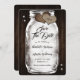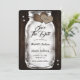 Casamento russo salve o cartão de datilografia com um jarro de pedras com luzes de cordas e corações de burpas contra um fundo de madeira de celeiro enfeitado com luzes de brilho. Personalize facilmente este casamento rústico e fofo, salve a data online. Itens correspondentes disponíveis para complementar este casamento romântico, salvar a data.